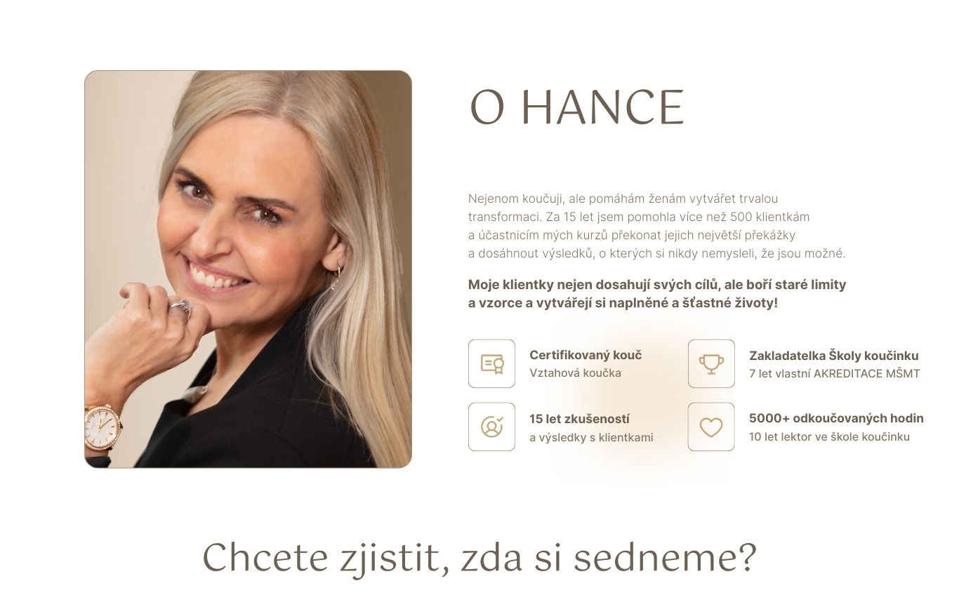 Kurz probíhá od září do listopadu 2026 a obsahuje celkem 3 víkendové moduly živě v Praze, pracovní materiály a přístup do uzavřené skupiny. Možnost rozdělené platby. TENTO KURZ MŮŽEŠ DOPLNIT O ROČNÍ ŠKOLU KOUČINKU S HANKOU (120 hodin, akreditace MŠMT). Velmi nápomocný ti však bude i jako samostatný kurz. Cena za oba kurzy společně: 84.000 Kč.